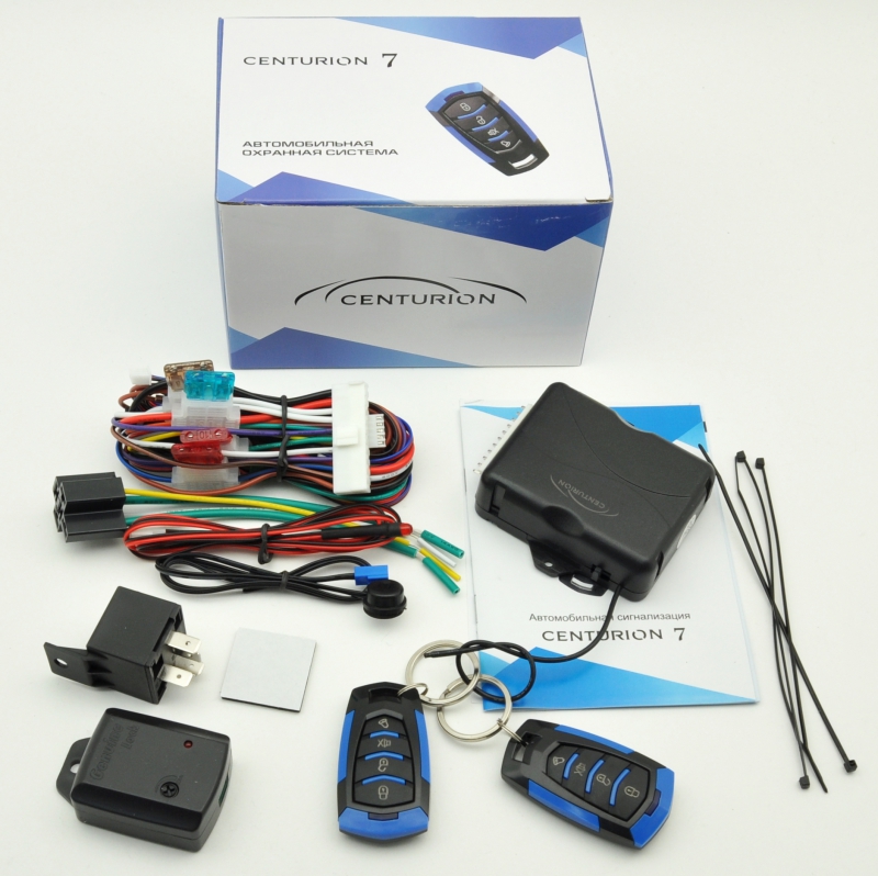 Centurion 7 комплектуется двумя брелоками без обратной связи с оригинальным дизайном. Он имеет прочную окантовку синего цвета и четыре клавиши управления. Помимо этого, у него компактные размеры и стильный корпус. В данном брелоке используется стандартная для таких систем динамическая кодировка сигнала, когда код меняется каждый раз при нажатии кнопки.