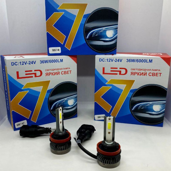 LED-лампы автомобильные головного света K7 - комплект 2 штуки. Светодиодные лампы дают чистый белый свет, высокую яркость, широкую зону свечения. Фары светодиодные образуют ровную границу света и тени. Устанавливаются вместо штатных ламп без переделок. Лед лампы подходят для противотуманных фар. Светодиодные автомобильные лампы светят ярче штатных, но при этом не ослепляют встречных водителей. Автолампы характеризуются ровным свечением без мерцания. Преимущества моделей IRON HORSE: прочный и жесткий металлический корпус;встроенный радиатор охлаждения;универсальность - диодные лампы подходят для ходовых огней автомобилей любых марок;надежность в неблагоприятных погодных условиях. K7: Напряжение 12/24 В, световой поток 6000 Лм, мощность 36 Вт.