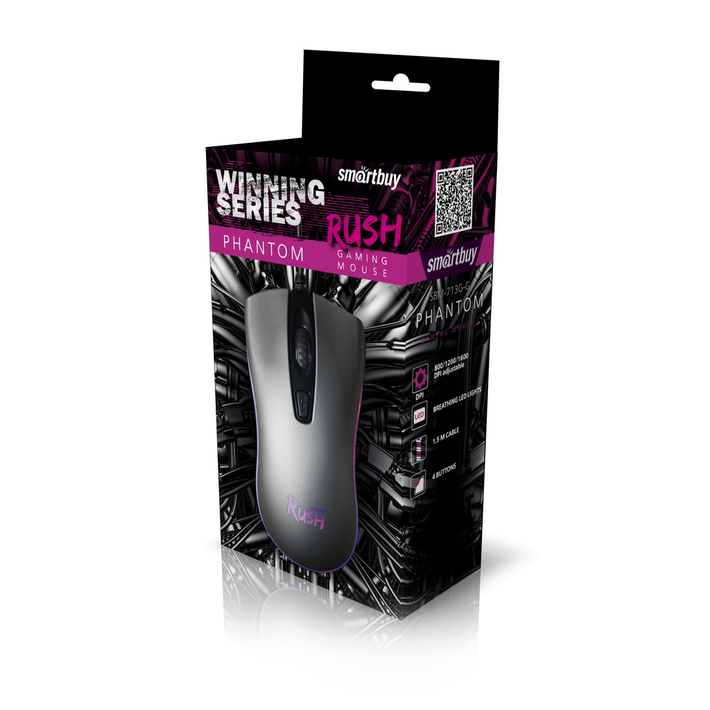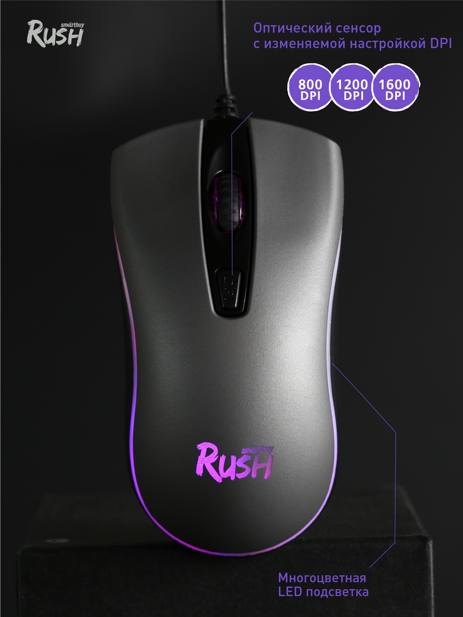 Проводная игровая мышь Smartbuy Rush Phantom. Модель наделена высококачественным износостойким покрытием с эффектом «Soft-touch». Кнопка смены DPI имеет 3 ступени разрешения 800/1200/1600. Динамическая LED подсветка точно не оставит вас без внимания. Эргономичный захват - модель идеально подойдёт для большинства размеров рук. Всего 4 кнопки управления (вперед, назад, колесо прокрутки, кнопка смены DPI). Лёгкая установка, для работы не нужны дополнительные драйверы.